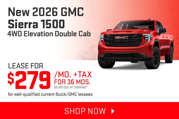 *Lease a New 2026 GMC Sierra 1500 4WD Elevation Double Cab with TurboMax engine for $279/mo. Example: STOCK# JG3224, MSRP $53,595. Well-qualified lessees may lease for $279/mo for 36 months with $5,915 total due at signing (includes down payment, first monthly payment, bank acquisition fee, $420 doc & title prep fees, $0 security deposit). Includes $3,250 incentive for customers with a Buick or GMC leased vehicle in household (not all will qualify). Sales tax, title, reg fees additional. Closed end lease. 10,000 miles/year. Available on indicated stock number(s) only. All incentives to dealer, may not be combined with other offers. Take delivery by 4/30/2026.